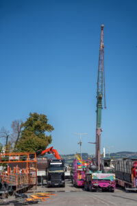 Der Auf- und natürlich auch der Abbau folgt einer strengen Choreografie, denn erst wenn die „dicken Brummer“ wie Crazy Mouse, Riesenrad oder Autoscooter stehen und deren Zugmaschinen und Autokräne das Areal verlassen haben, können die kleineren Hütten und Stände kommen.